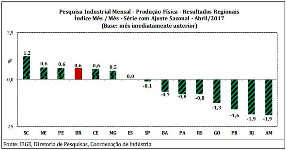 Cinco dos 14 locais pesquisados tiveram aumento no ritmo de produção industrial, com destaque para o avanço de 1,2% em Santa Catarina e que eliminou parte da perda de 4,0% registrada em março do ano passado. Ainda segundo a Pesquisa, Região Nordeste e Pernambuco também tiveram um crescimento de 0,6%, cada, e Minas Gerais, 0,5%. Já o Espírito Santo repetiu o patamar observado no mês anterior, continuando com 0,0%.