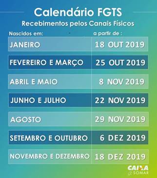 A Caixa antecipou o calendário do Saque Imediato do FGTS para que todos os trabalhadores possam receber os seus recursos ainda em 2019, conforme cronograma: