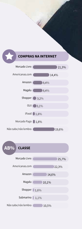 No recorte das classes A e B, as marcas que foram mais lembradas foram Mercado Livre (25,7%) e Americanas.com (22,3%), o que representa um empate técnico, visto que a margem de erro é de quatro pontos percentuais para mais ou para menos. Em seguida aparecem Amazon (14,6%) e Magazine Luiza (10,1%).