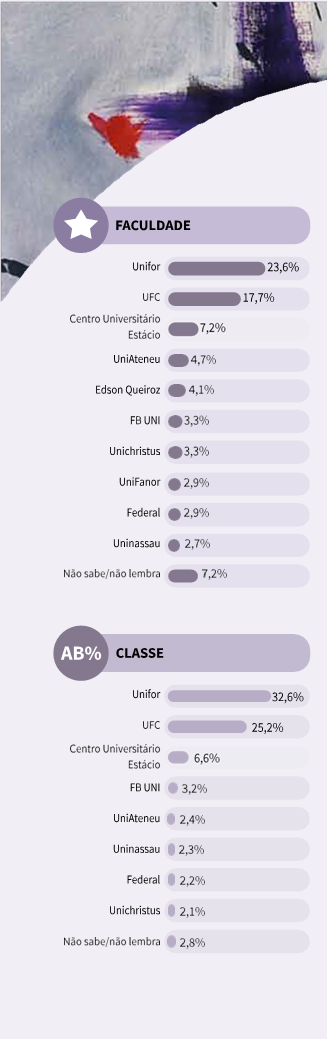 As demais faculdades lembradas foram UFC (17,7%), Centro Universitário Estácio (7,2%), Ateneu (4,7%, em provável referência à UniAteneu), Edson Queiroz (4,1%, provavelmente, em referência à Unifor, pertencente ao Grupo Edson Queiroz), Farias Brito (3,3% em provável referência à FB Uni), UniChristus (3,3%), Federal (em provável referência à UFC, 2,9%), Fanor (2,9%, em provável referência à UniFanor), Maurício de Nassau (2,7%, em provável referência ao Centro Universitário Maurício de Nassau (Uninassau)), entre outras menos citadas.