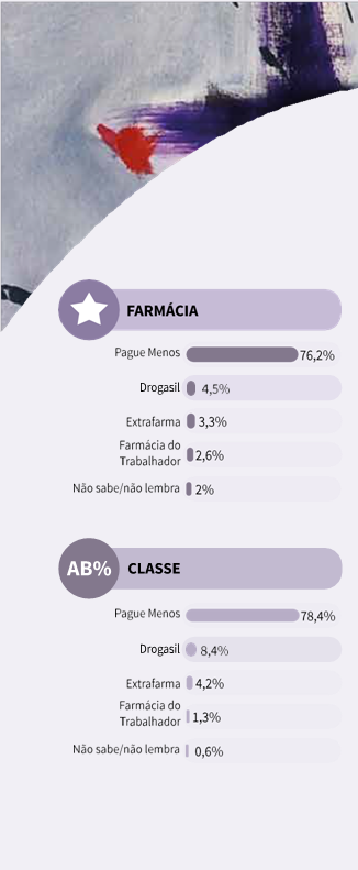 Nas classes A e B, a porcentagem da Pague Menos é um pouco maior, chegando a 78,4% de recall. Neste recorte de classe, a Drogasil (8,4%) ultrapassa a Extrafarma (4,2%), e a Farmácia do Trabalhador apresenta 1,3% das menções. Aqui, apenas 0,6% não soube ou lembrou nenhuma marca da categoria.