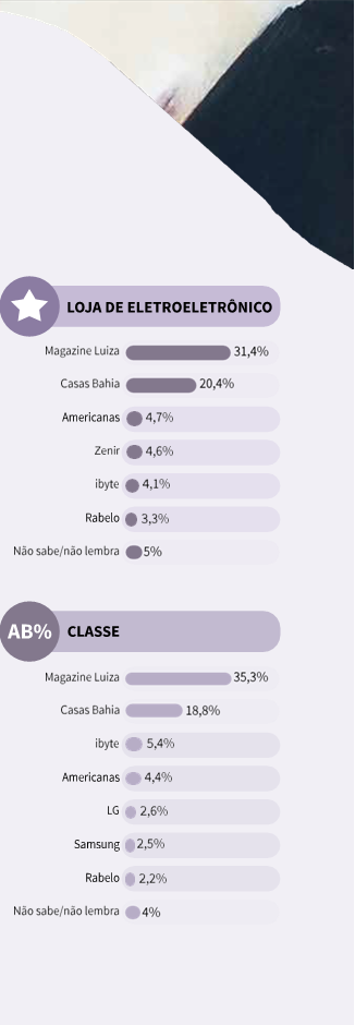 Após dividir a liderança com Casas Bahia na pesquisa pas- sada, a marca Magazine Luiza assume a liderança na categoria Loja de Eletroeletrônico, passando de 27,6% das menções, no levantamento 2020-2021, para 31,4% na pesquisa Anuário Datafolha Top of Mind 2021-2022. Esta é a segunda vez que Magazine Luiza é a vencedora da categoria em 13 edições. A Casas Bahia ficou em segundo lugar, ao receber 20,4% das menções. Em seguida, aparecem Americanas (4,7%), Zenir (4,6%), ibyte (4,1%) e Rabelo (3,3%).